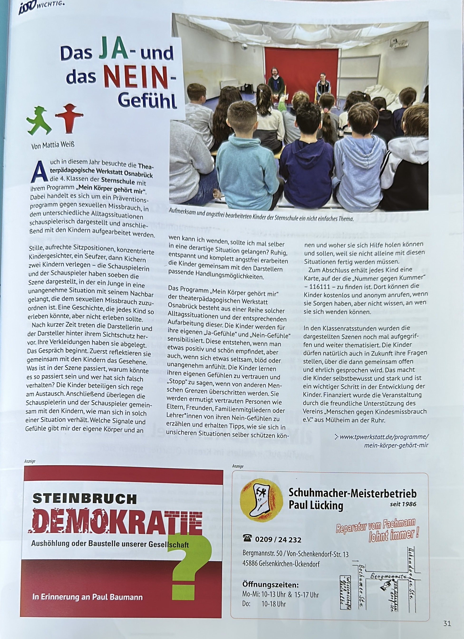 Im Folgenden finden Sie eine Auswahl bereits durchgeführter Theateraufführungen, die mit dem Ziel der Prävention stattgefunden haben. Dank Ihrer Hilfe werden wir immer mehr Schulen bei der wichtigen Präventionsarbeit finanziell unterstützen können. Gerne können Sie auch den Kontakt zu einer Grundschule in Ihrer Umgebung herstellen.