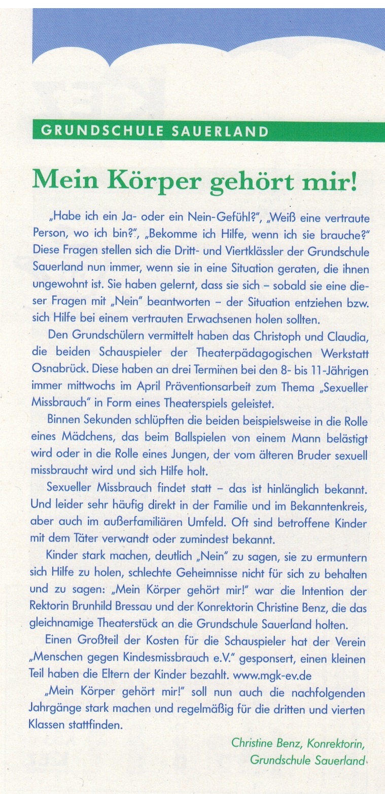 Im Folgenden finden Sie eine Auswahl bereits durchgeführter Theateraufführungen, die mit dem Ziel der Prävention stattgefunden haben. Dank Ihrer Hilfe werden wir immer mehr Schulen bei der wichtigen Präventionsarbeit finanziell unterstützen können. Gerne können Sie auch den Kontakt zu einer Grundschule in Ihrer Umgebung herstellen.